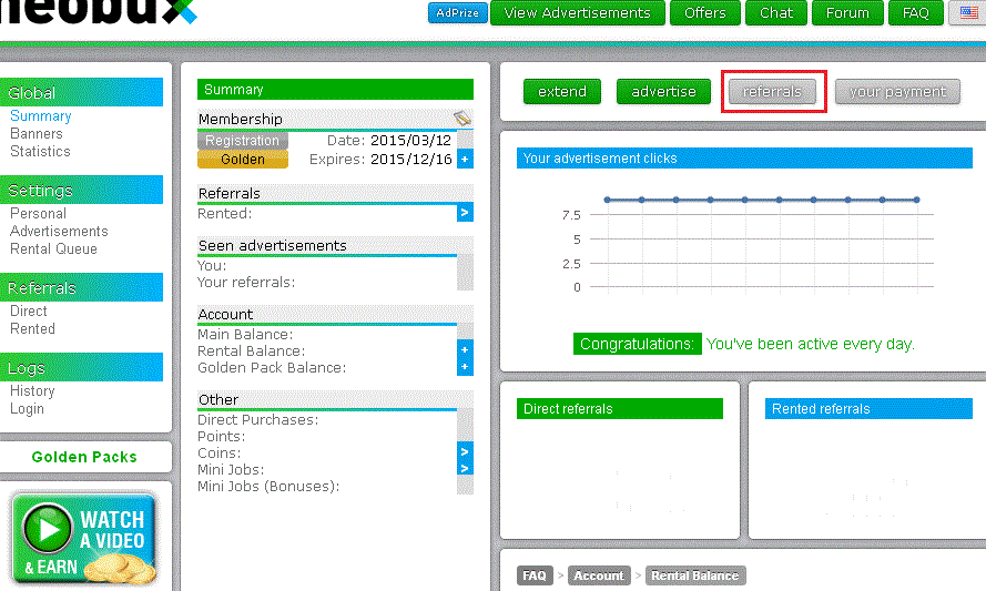 However, I am not skilled in how to persuade people to do something, even if it brought them profit and even if they are my friends and family. I'm not the type of 'seller'. That is why NEOBUX proved to be the right decision for me: this website allows two types of referrals. Direct (which I have just described) and rented. As well as direct, rented referrals are clicking on the ads and you earn from their clicking. The way you reach them is different: you buy rented referrals from NEOBUX on a certain period of time. During this period, they are clicking for you and you earn from them. One rented referral will cost you around $0.2 per month. I am not familiar with any other PTC site except NEOBUX that have the option to rent referrals.